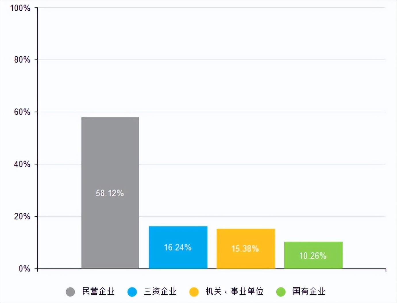 温州肯恩大学2021届直接就业毕业生主要流向民营企业,占全体就业毕业生的 58.12%,其中包括吉利控股、奥克斯空调、海量、立信会计师事务所等;其次为三资企业(16.24%)与机关、事业单位(15.38%),如雀巢中国、百胜中国、毕马威、达能、温州肯恩大学、浙江省第一监狱等;包括中国银行、中国工商银行、中国石油天然气在内,进入国有及国有控股企业就业的毕业生占比 10.26%。