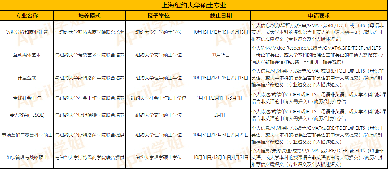上海纽约大学的硕士招生并不多,最开始只有5个专业,最近又新增了2个,属于中美联合培养模式,因此在申请要求的内容上并不少,基本和申请本校时一样,但是在成绩的具体要求上会相对更低一些。