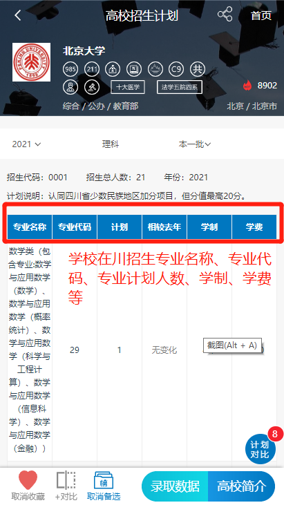 登录金榜路,点击招生计划栏目查询心仪大学招生科类、批次、学校代码、专业代码、招生人数、学费、学制等信息。