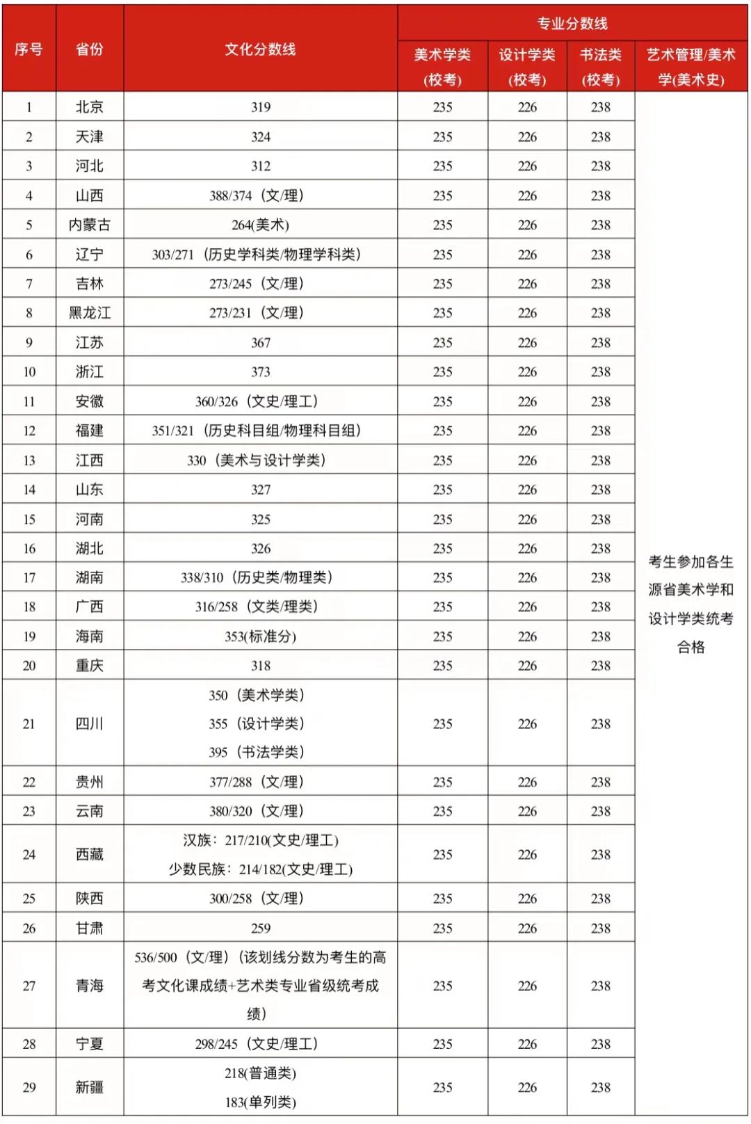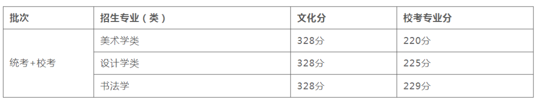 艺术史论:艺术史论专业初选合格的考生,高考成绩达到所在省份本科文史类一批线,文化课相对成绩山东不低于127.49、河北不低于126.88、江苏不低于119.81、其他省份不低于115.88可予录取。以上录取人数15名。