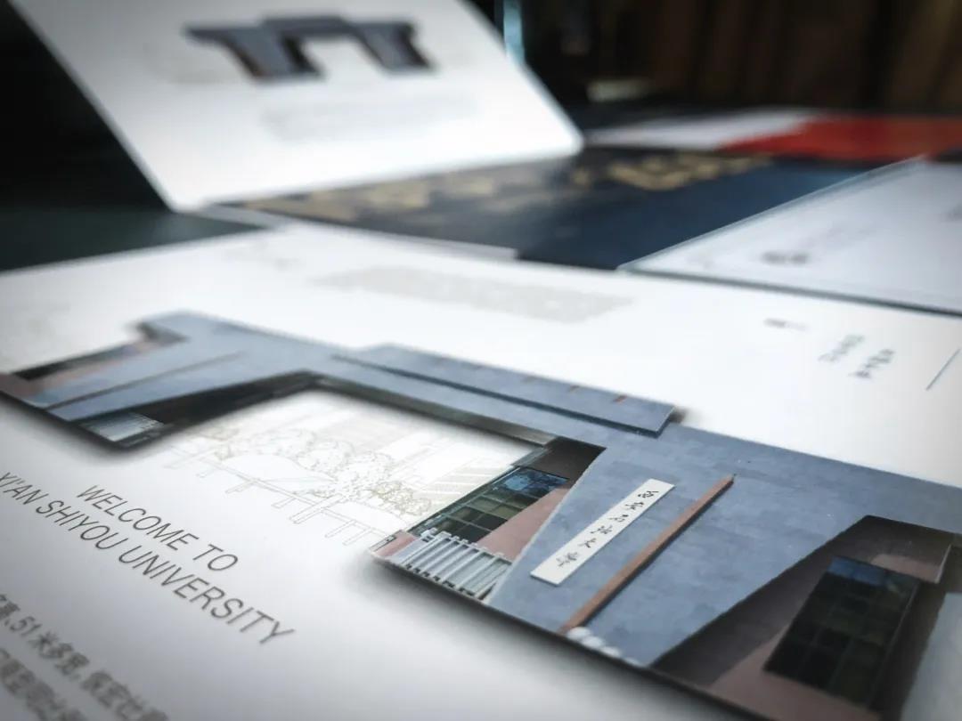 通知书封套与内页采用深蓝色和浅金色,深蓝色具有沉稳、庄重、理智、博大和广阔的意象,同时又是石油重工最契合的色彩;浅金色寓意珍贵,石油又称作"液体黄金",浅金作为辅助色,表达十年寒窗得来高校录取结果的璀璨时刻。实景UV质感的学校鄠邑校区东大门,触感真实有如身临其间。