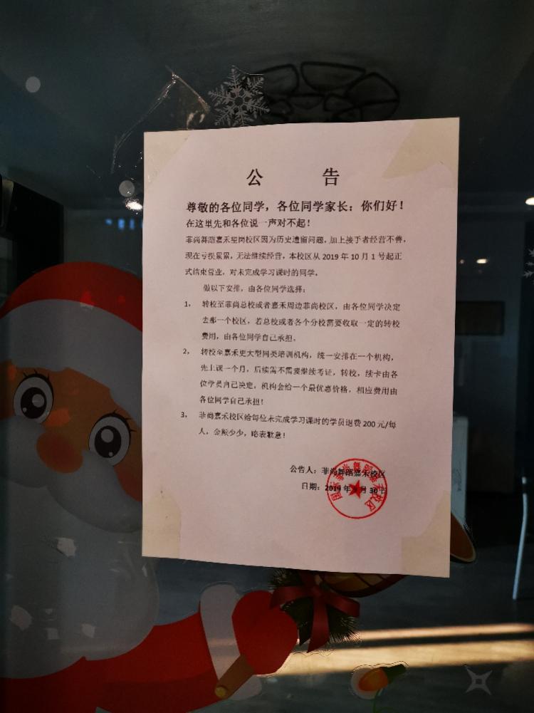 南都记者在位于白云区嘉禾街道尖彭路6号的盈通创客写字楼3楼看到,名为“菲尚国际舞蹈”的培训机构大门紧闭。大门贴有公告,称“菲尚舞蹈嘉禾望岗校区因为历史遗留问题,加上接手者经营不善,现在亏损累累,无法继续经营。”