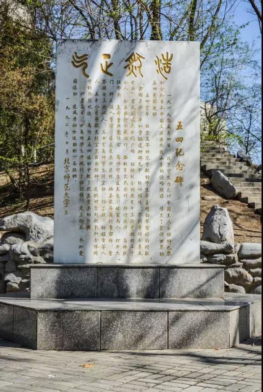 这块碑是"五四"纪念碑。1984年,为纪念"五四"运动65周年,学校在图书馆前修建了"五四"纪念亭,1992年在亭内建立了"五四"纪念碑。碑文详细记录了"五四"运动中北京高等师范学校学生的英勇事迹。2002年,因建设主楼,纪念亭被拆除。2004年,在师生的倡议下,学校在最短的时间内完成了纪念碑的复建工作。