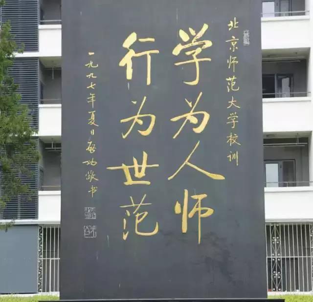 校训碑阳面"学为人师,行为世范"八字由启功先生所题,紧扣"师范"二字,包含了学与行,理论与实践,做学问与做人等之间的辩证关系。校训碑阴面则是启功先生题的一首诗:"学府英名,祖国殊荣。群伦领袖,教育高风。周一百岁,学术峥嵘。千秋万世,木铎长鸣。"一代代北师大学生薪火相传,以校训精神严格要求自己、激励自己,也使北师大的光荣传统代代相传。