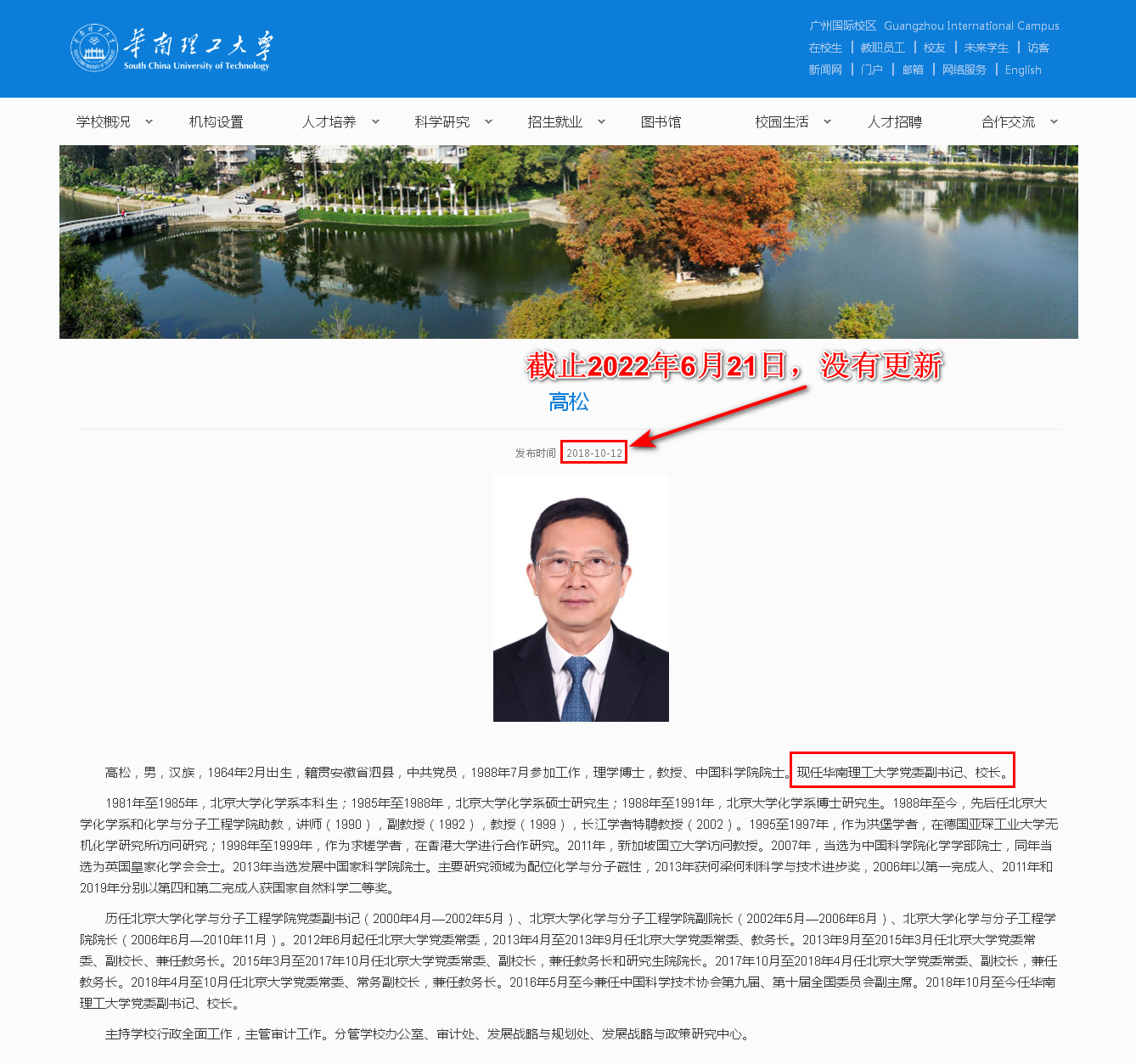 那么华南理工大学校长是谁呢?咱们再去华南理工大学官网看看。华南理工大学校长从2018年高松任职以来,目前没有任何更新。