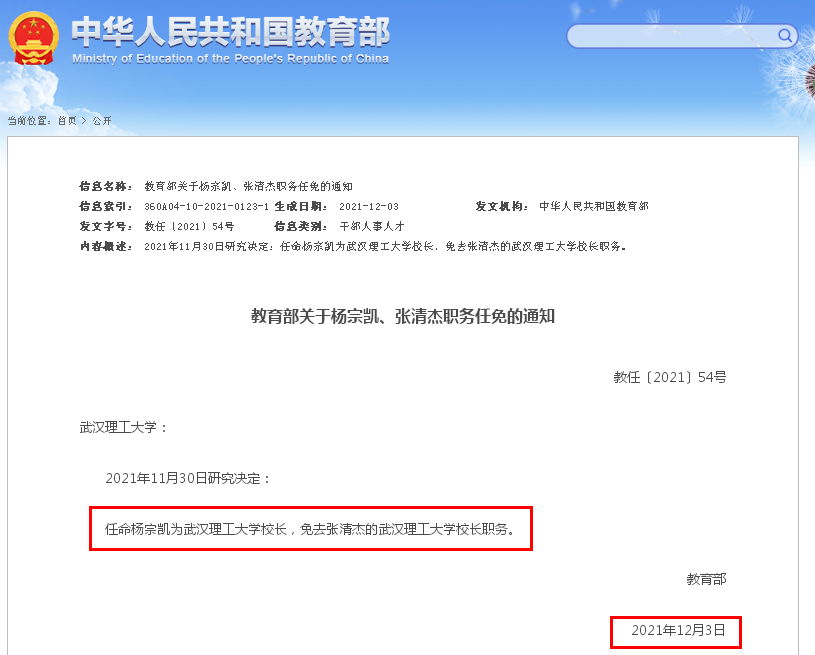 2021年教育部任命杨宗凯为武汉理工大学校长。而又没有免去西电的校长职位。所以目前西电和武汉理工大学校长都是杨宗凯。