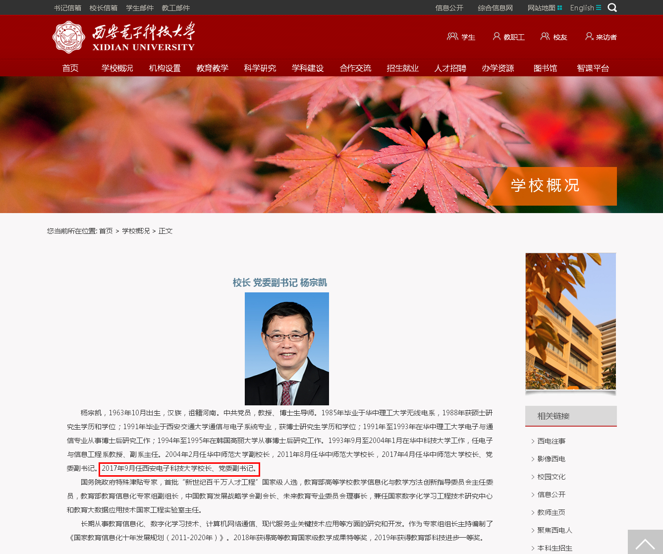 西安电子科技大学校长杨宗凯,是2017年任职,目前西电网站上领导介绍仍然是杨宗凯。
