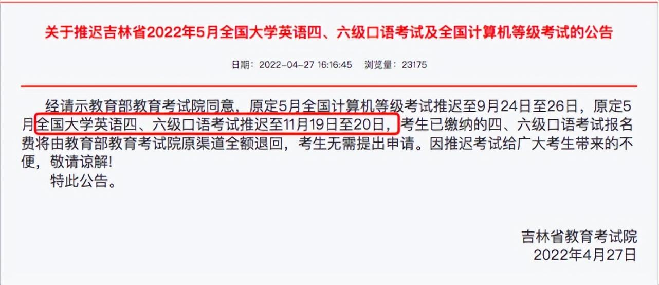 吉林省 笔试、口语延期