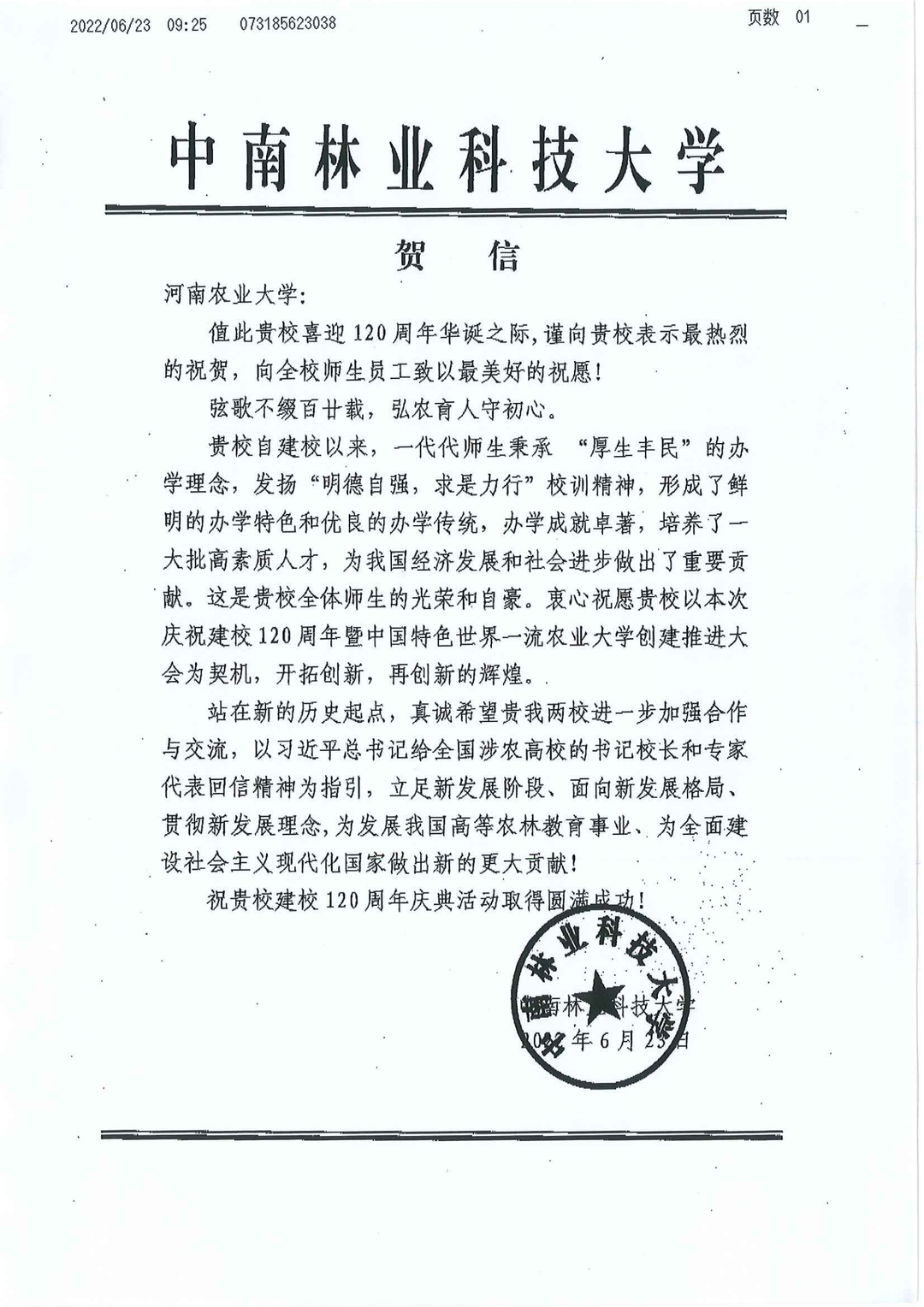 二十四、中南林业科技大学 贺信