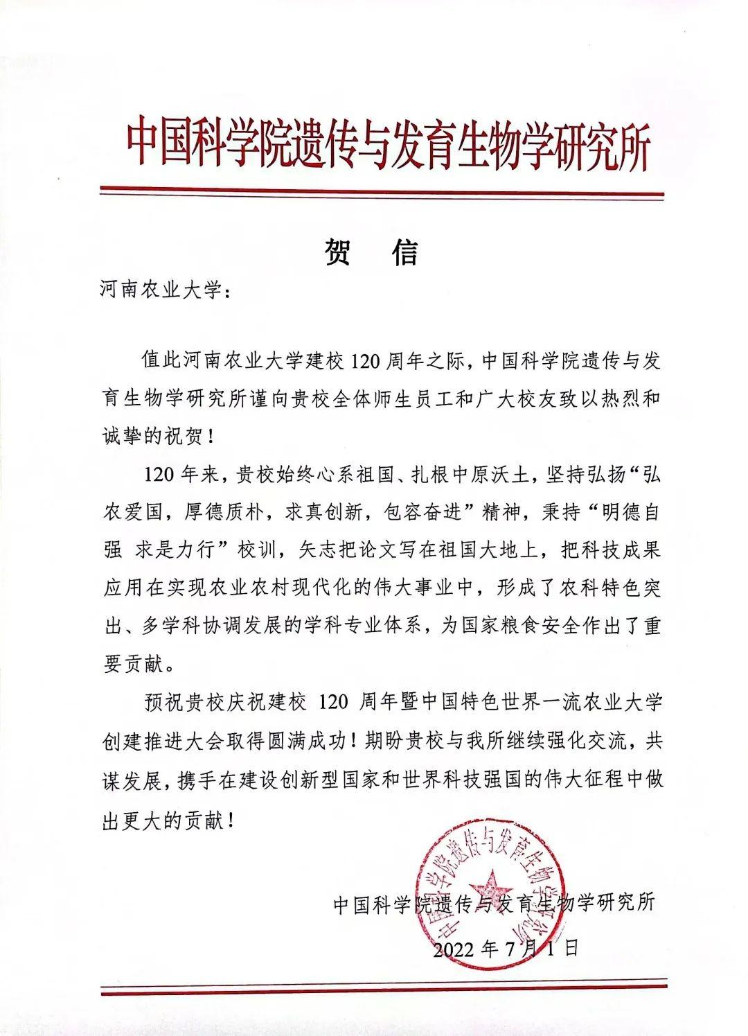 二、中科院遗传与发育生物学研究所贺信