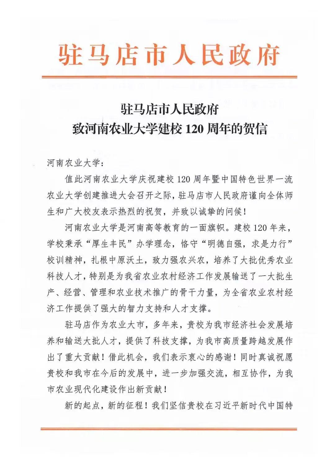 五、驻马店市人民政府 贺信