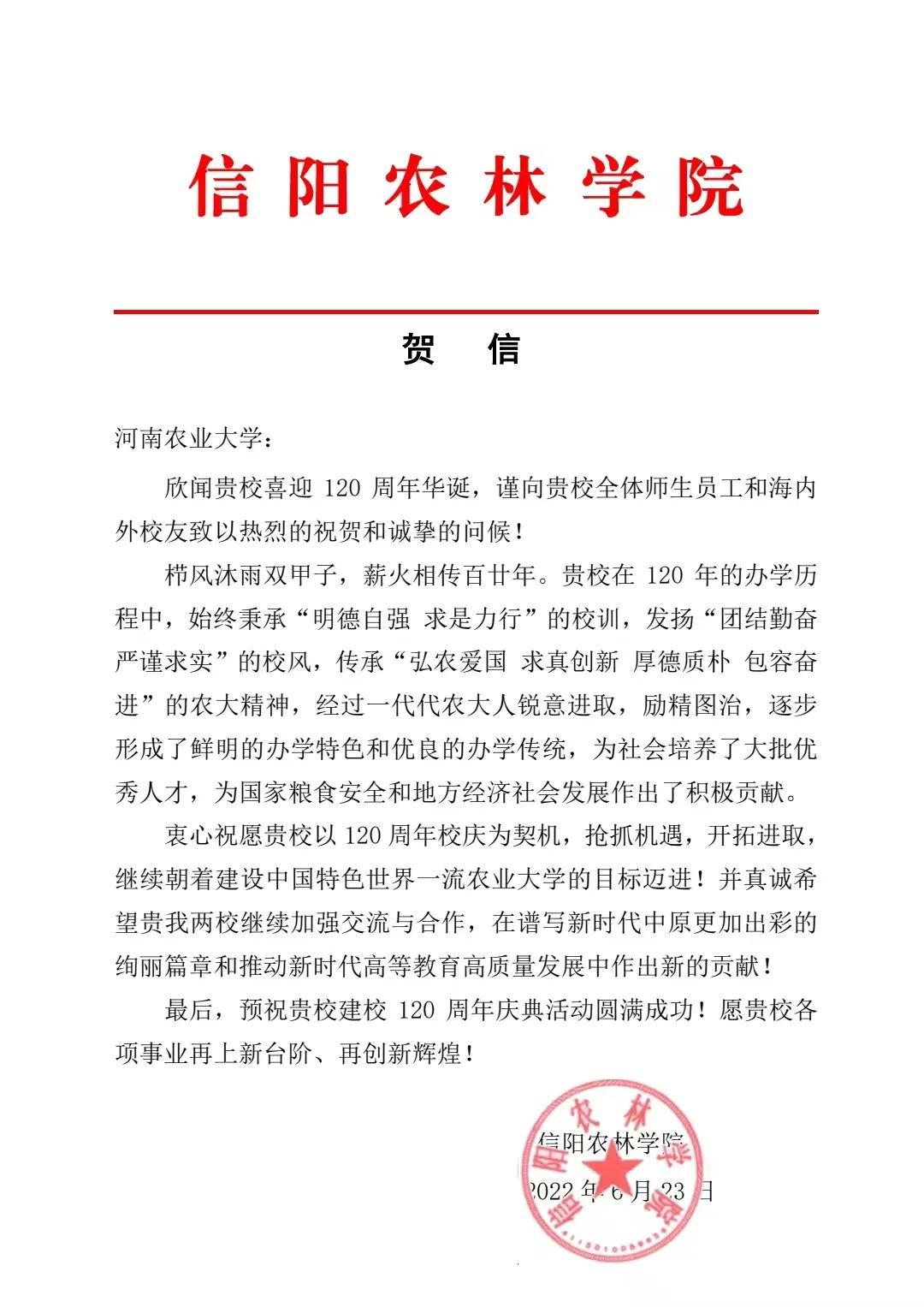 一、信阳农林学院 贺信