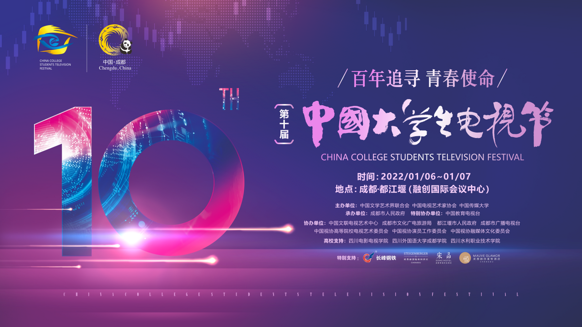 第十届中国大学生电视节即将于2022年1月6日至7日在成都融创文旅城国际会议中心举行。本届大学生电视节由中国文学艺术界联合会、中国电视艺术家协会、中国传媒大学共同主办,成都市人民政府承办,中国教育电视台特别协办,以“百年追寻•青春使命”为主题,聚焦中国共产党成立百年之光辉历程,继续发扬活动特色,在保持品牌延续性的基础上加强对大学生艺术实践的扶持和引导,更好展现新时代青年学生的精神风貌和使命担当。