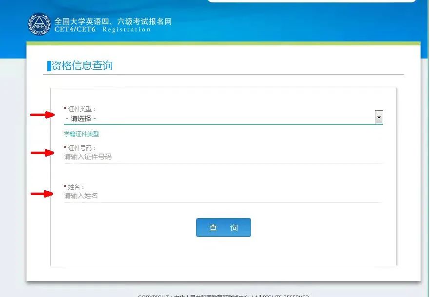 3.进入资格信息查询页面,输入三项必填项:证件类型(不支持军官证)、证件号码、姓名,点击“查询”。