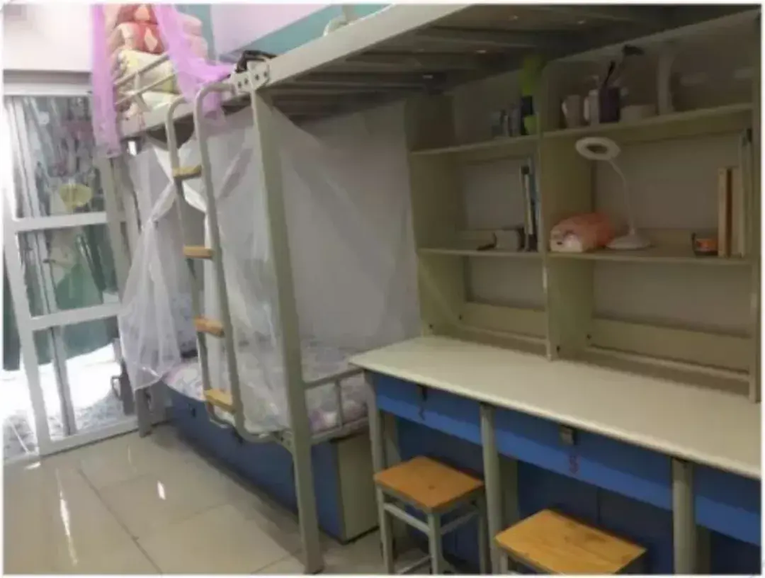 宿舍为6人间,每间宿舍都有独立的卫生间、独立的洗澡间、空调、衣柜、写字桌。