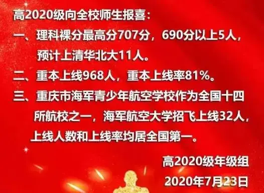 重本上线968人,重本上线率81%;理科最高707分,690分以上5人。空飞32人。