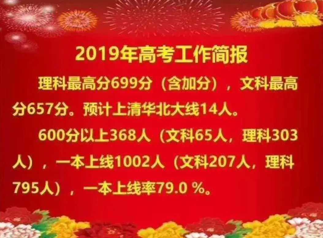 理科最高分699分(含加分),文科最高分657分,预计上清华北大线14人。600分以上368人(文科65人,理科303人),一本上线1002人(文科207人,理科795人),一本上线率79.0%。