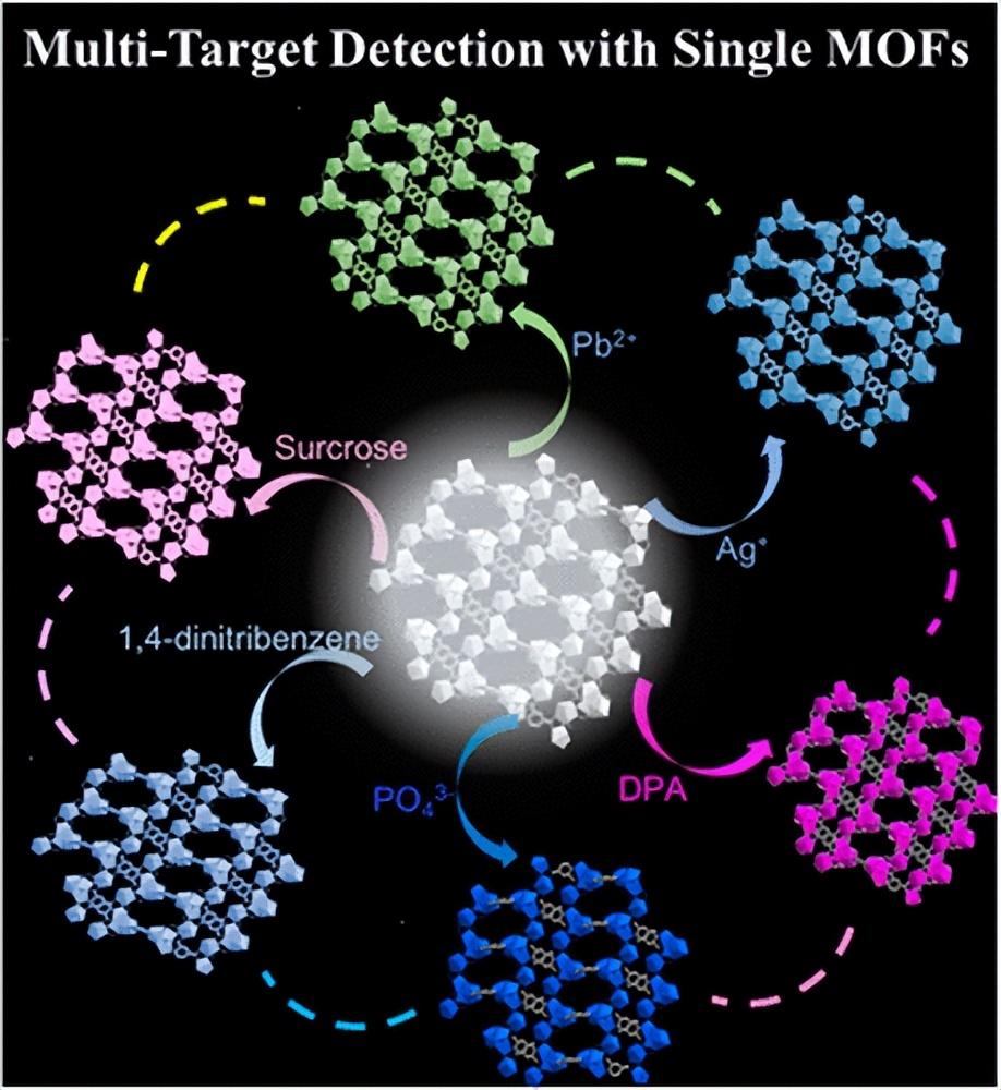 图8. 白光MOF的设计及单一基质、单一激发、单一信号源的多目标物可视化检测。