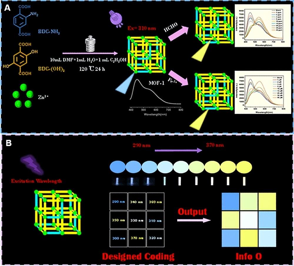 该团队以Eu3+和Tb3+为金属节点,与间二甲酸苯硼酸反应分别制备红光Eu-MOFs和绿光Tb-MOFs,与蓝光UiO-66-NH2一起,制备三原色MOFs墨水。以此为基础,他们提出了基于荧光颜色为存储信息的新型防伪编码策略。该编码在日光下无色,在275 nm的单一激发下实现信息解码(ACS Appl. Mater. Interfaces, 2018, 10, 22445-22452)。