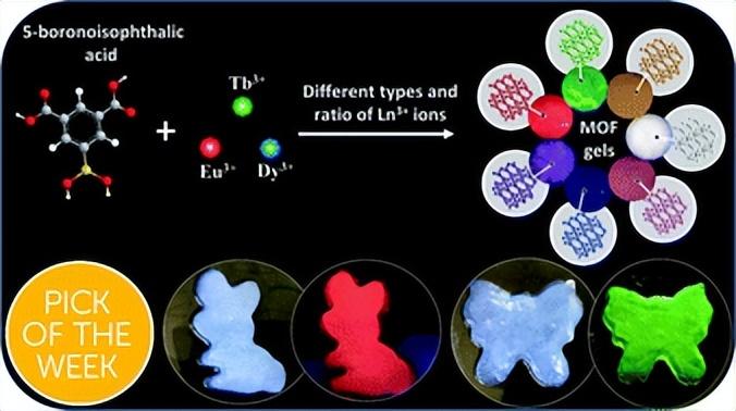 该团队发现间二甲酸苯硼酸在常压下基于水热反应可以与Ln3+离子形成MOF凝胶,调控Eu3+、Tb3+和Dy3+的比例,得到了不同发光混合金属MOF凝胶。利用275 nm激发下不同颜色的发光,通过MOF凝胶实现了彩色发光。该工作入选Chemical Science 当周精选(Chem. Sci., 2019, 10, 1644-1650)。