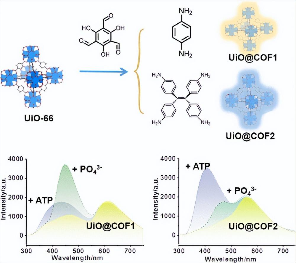 该团队提出了MOF包覆共价有机骨架(COF)的策略,利用MOF和COF的同时发光,实现双发荧光。首先利用2-氨基对苯二甲酸与锆离子制备UiO-66-NH2,利用席夫碱反应接枝三羟基均苯三醛,进一步利用对苯二胺或四氨基四苯乙烯的席夫碱反应引入有限层COFs,通过薄层COF降低其自身的聚集诱导猝灭发光。基于UiO-66-NH2和COF的同时发光,实现了双发荧光。他们利用锆离子对磷酸基团的特异性识别,结合磷酸根和ATP尺寸的不同,实现二者的有效区分和可视化检测(ACS Appl. Mater. Interfaces, 2020, 12, 20973-20981)。