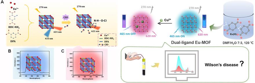 图5. 混合配体与铕离子制备MOFs,实现双发荧光及对铜离子和次氯酸的可视化检测。