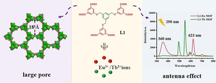 图4. 柔性配体同时实现大孔MOFs和镧系离子的天线效应发光。
