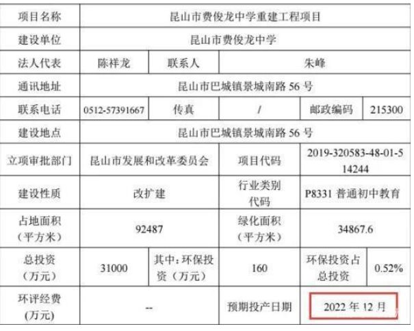 费俊龙中学重建工程用地面积约92487平方米,项目总投资约3.1亿元。早前公示过的环评文件显示,学校重建后预期于2022年12月投产,拟设置初中10轨30班。