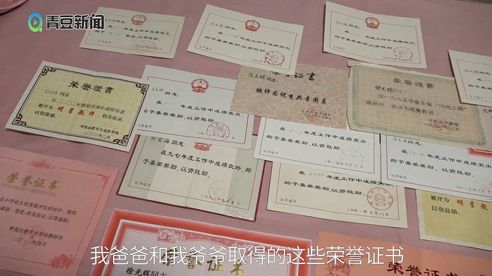 没错,这是一个四代书香世家。几代人获得的荣誉证书铺了一床。