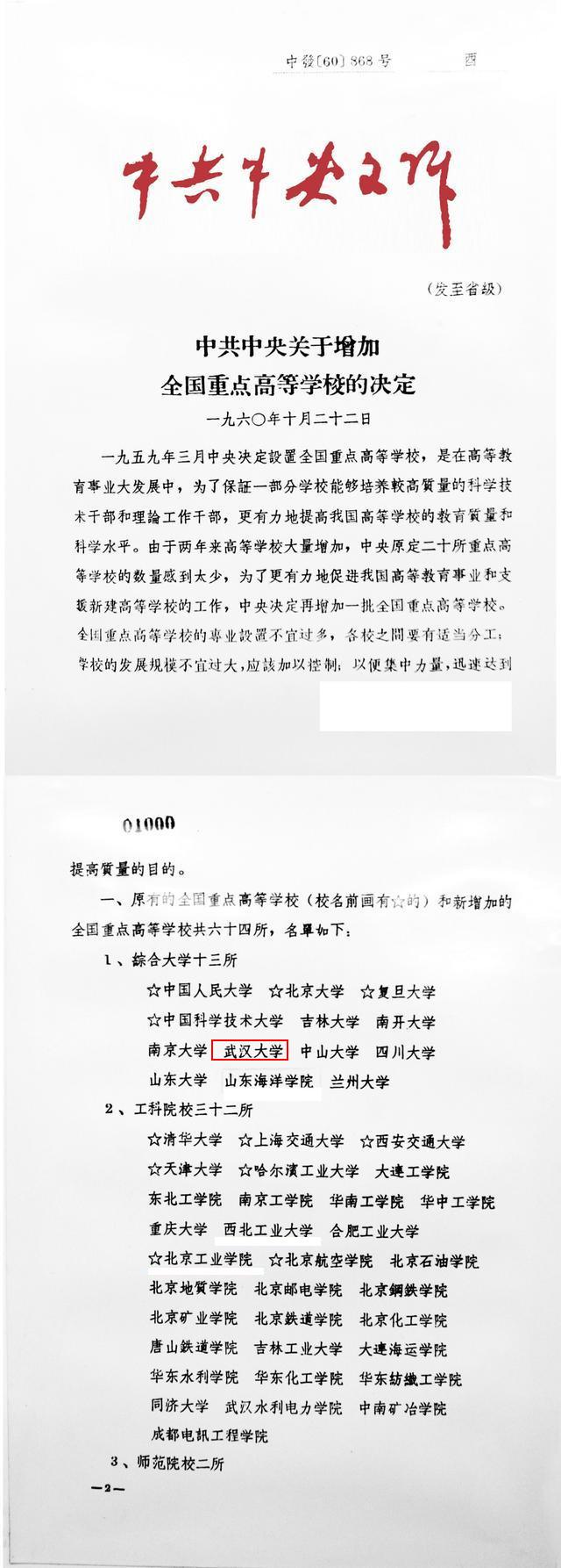 1946年,学校已形成文、法、理、工、农、医6大学院并驾齐驱的办学格局。当时是第二中山大学,1960年,武汉大学被列为综合性全国重点大学,当时总有13所综合性重点大学。