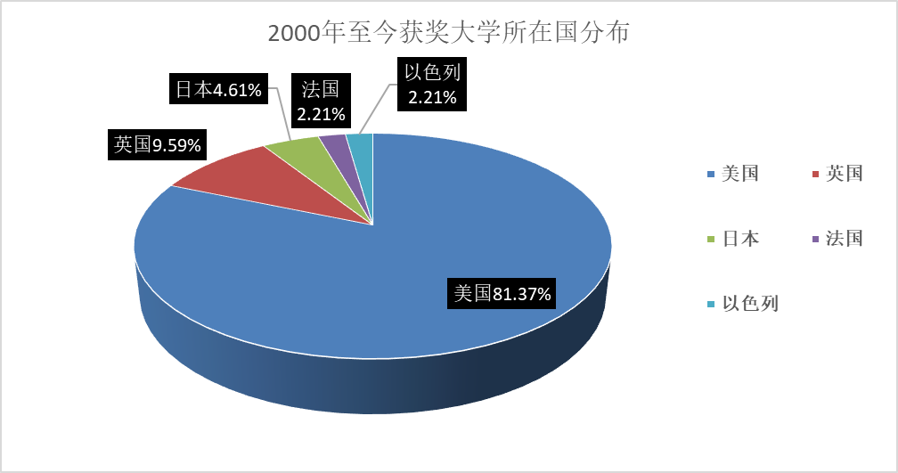 2000年至今的获奖人数前20位大学中最让人惊讶的是日本大学和以色列的大学,日本京都大学以13人与霍普金斯大学并列第15位,东京大学则与明尼苏达大学以11人并列第20位。