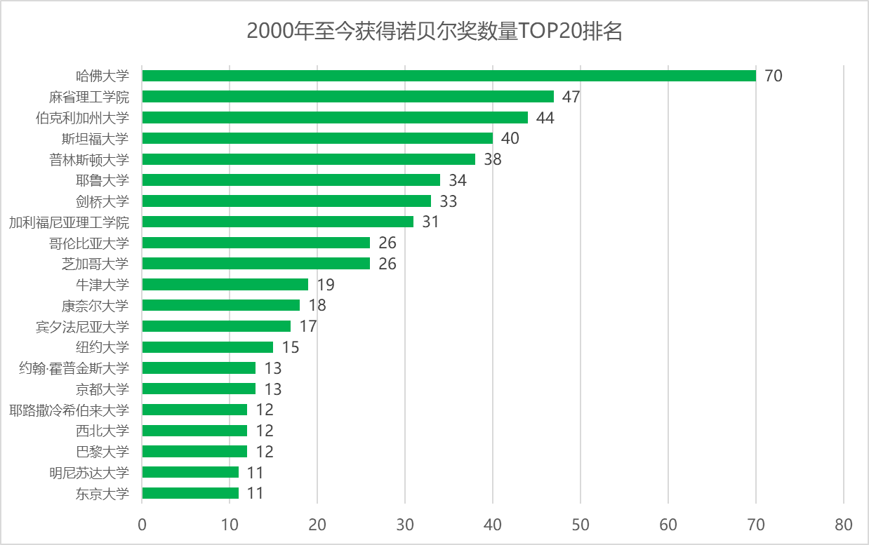 2000年至今诺奖获得人数TOP前20大学国家分布,美国的优势进一步扩大。