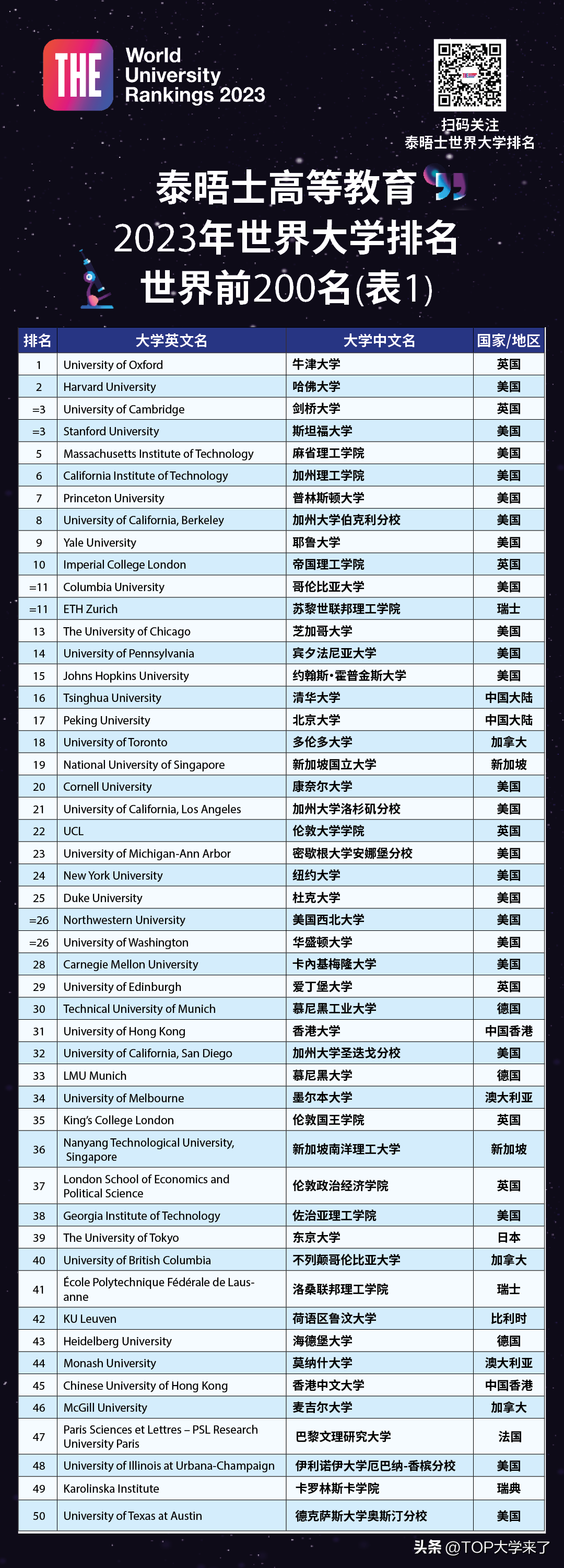 “TOP大学来了”小编按,10月12日,泰晤士高等教育(THE)2023年度世界大学排名发布,清华大学、北京大学、复旦大学、上海交通大学、浙江大学、中国科技大学、南京大学7所内地高校跻身世界百强。