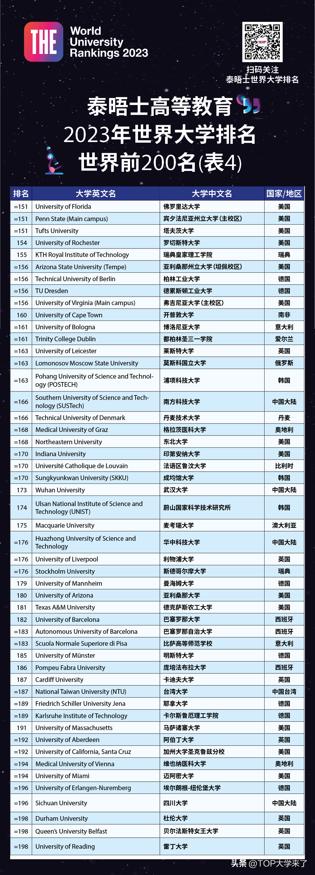 2023年的排名中共有来自104个国家/地区的1799所大学上榜,较去年增加了137所,创历史新高。