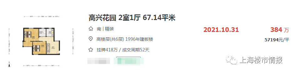 高兴花园对口是闵行实验的畹町校区+莘松中学,2020年疫情过后,高兴花园的成交价一度攀升。2021年初,高兴花园的成交价一度攀升到9w+/平,其中一套1室1厅,总面积47平米的房源,成交价高达99560元/平,成交周期仅6天。