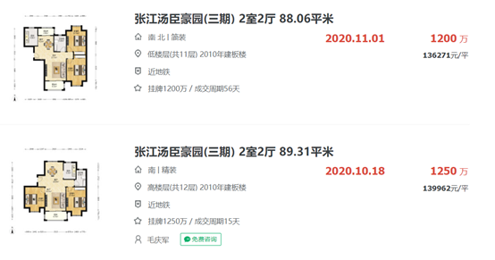 浦东除了梅园板块外,还有一个高位杀跌的盘,就是张江汤臣豪园。2020年10月后,挂牌价高达14万,2021年年初,更有16万+㎡接盘的客户。
