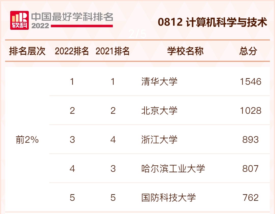 软科中国最好学科排名出炉,在计算机科学与技术专业中,共有143所高校上榜,其中清华大学、北京大学、浙江大学、哈尔滨工业大学、国防科技大学位列前2%。