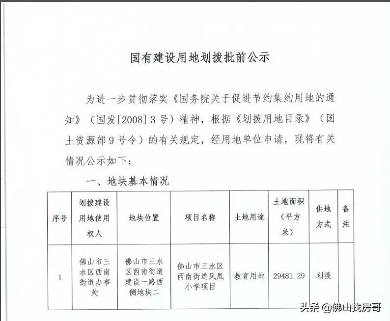 11月4日,三水区政府网站发布关于佛山市三水区西南街道凤凰小学项目国有建设用地划拨批前公示,从公示内容中显示三水凤凰小学用地正式获批,供地方式为划拨,总占地面积29481.29㎡。