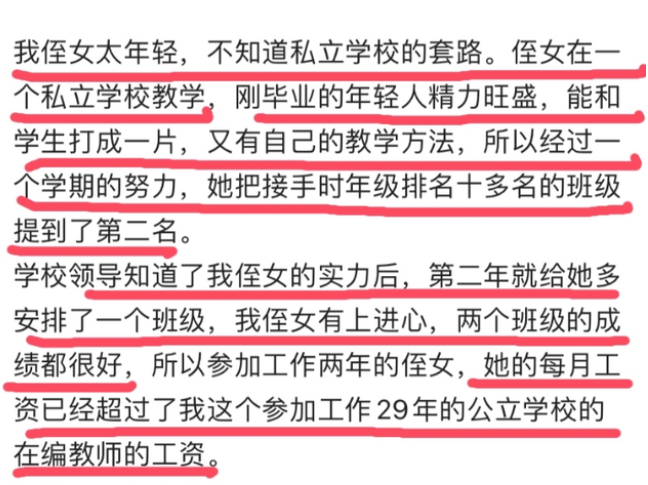 一位网友分享出自己侄女的亲身经历,当了老师之后才知道原来水这么深,这位教师毕业之后选择了去私立学校任教,因为私立学校不需要考编,收入还比公立学校要高。