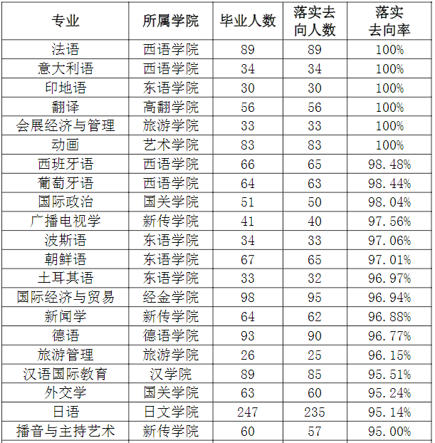 从专业看,多个专业就业率达95%以上,法语、意大利语、印地语、翻译、会展经济与管理、动画等六个专业的就业率达100%。