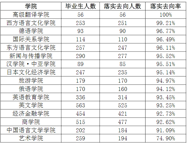 多年来,学校着力提高人才培养质量,取得了明显效果。毕业生因"外语功底扎实,交际能力强,综合素质高,适应工作快,敬业爱岗,踏实肯干,有发展潜力"而深受用人单位欢迎,就业率和就业质量保持在高水平。就业去向主要是国家部委、政府机关、外事部门、外贸系统、旅游行业、高等院校、三资企业、科研院所、国有大中企业以及军队、公安、海关、边检等单位。
