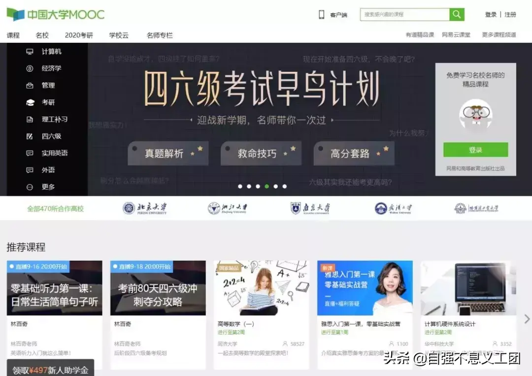 作为一个国内优质的学习平台,这个网站上拥有上千门课程,每一门课程的质量都非常高,因为是由985、211高校提供的课程内容。里面的课程涵盖的领域非常多,从计算机、心理学、法学到英语、艺术设计、摄影等等,而且基本免费,分类众多,跟着课程的进度学习还可以获得课程证书。