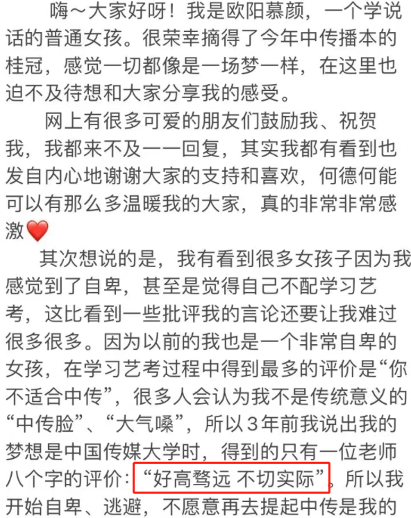 欧阳慕颜同学能够成为播音主持专业的第一名,也证明了自身的能力与优异,并用实力证明了“努力与收获成正比”,也希望其他艺术生能从中学习到优秀的精神与品格,并为自身打下良好的基础。