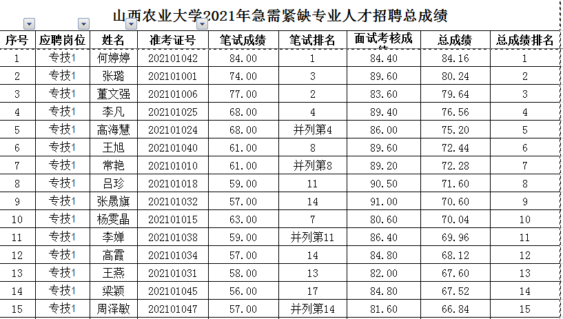 附件:山西农业大学2021年急需紧缺专业人才招聘总成绩