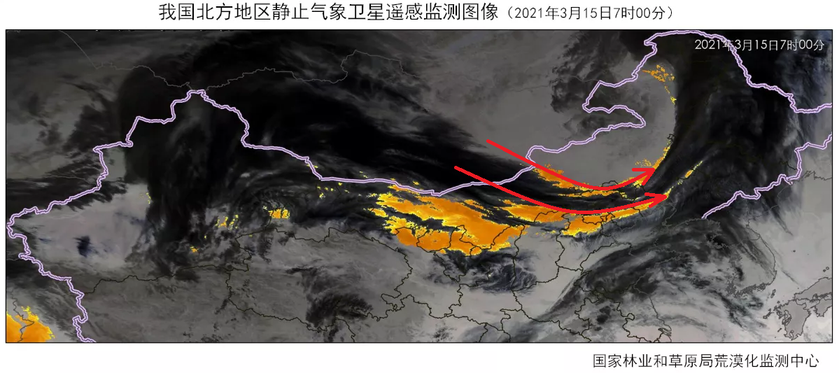 3月15日7:00的我国北方地区沙尘遥感,红线是气流入侵路径|图片来源:国家林业和草原局荒漠化监测中心+自制