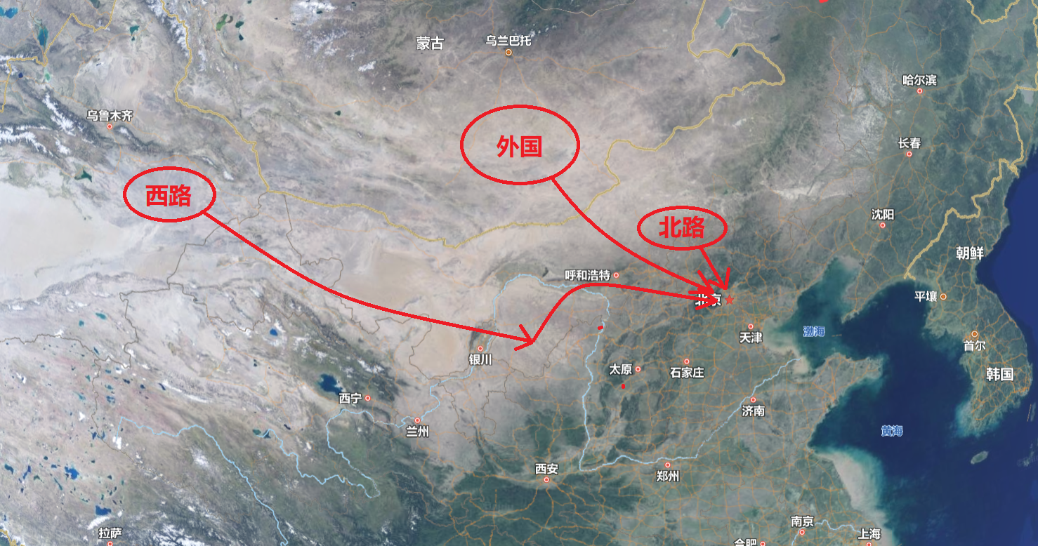 北京市历年来沙尘暴的主要输送路径|图片来源:百度地图+自制