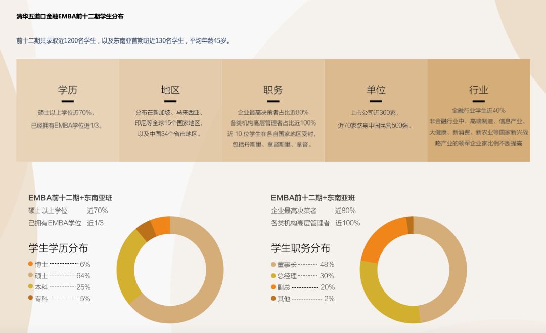 清华五道口金融EMBA自2012年项目创立以来,共招收十二期班1200余名同学,以及两期东南亚班近130名学生;平均年龄45岁, 已经拥有硕士以上学位约占70%,已经读过EMBA的学生接近32%;近 10 位学生在各自国家地区受封,包括丹斯里、拿督斯里、拿督;董事长、总经理、CEO等企业最高决策者占比近80%;各类机构高层管理者占比接近100%;覆盖了近360家上市公司,金融机构和实业界学生分别约占比40%和60%;