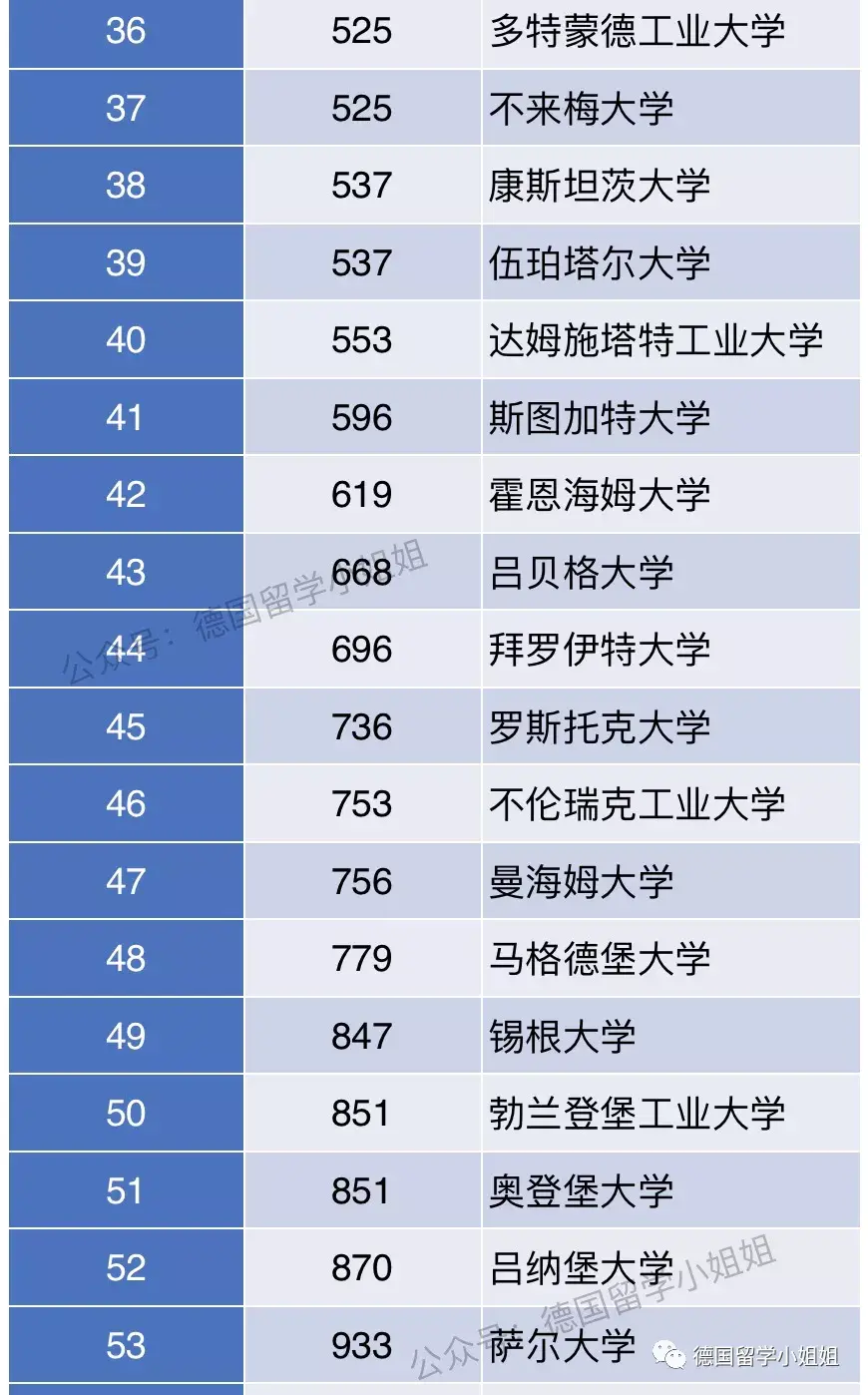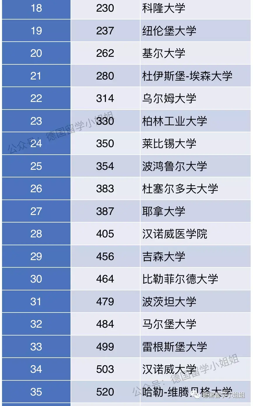 波恩大学,排名下降5位;汉堡大学,排名下降1位;弗莱堡大学,排名下降4位;亚琛工业大学,排名下降8位;卡尔斯鲁厄理工,排名下降19位;美因茨大学,排名下降16位;法兰克福大学,排名下降4位;莱比锡大学,排名下降8位;吉森大学,排名下降37位;乌珀塔尔大学,排名下降70位;多特蒙德工业大学,排名下降50位;雷根斯堡大学,排名下降13位;康斯坦茨大学,排名下降26位;不来梅大学,排名下降5位;达姆施塔特工业大学,排名下降10位;斯图加特大学,排名下降32位;勃兰登堡工业大学,排名下降191位;吕贝格大学,排名下降8位;锡根大学,排名下降163位;曼海姆大学,排名下降50位;罗斯托克大学,排名下降30位;不伦瑞克工业大学,排名下降24位;吕纳堡大学,排名下降129位;萨尔大学,排名下降177位;奥登堡大学,排名下降37位;格赖夫瓦尔德大学,排名下降79位;当然,挑选学校时,我们也不能只看排名,排名只是参考因素之一。