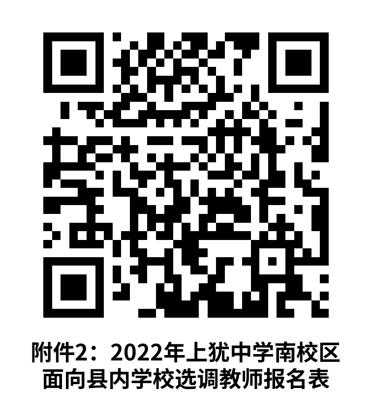 (2)网上报名要求:符合报名条件的教师自行到上犹县教科体局微信公众号下载填写《2022年上犹中学南校区面向县内学校选调教师报名表》(word格式),其他相关证明材料按要求及顺序编辑成一个PDF格式,将以上两个格式文件一并发送至syrsg2018@163.com,邮件命名为:报考学科+姓名+手机号码。同时扫描文后二维码(附件4)填写相关内容。