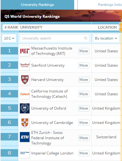 世界知名排名机构QS(Quacquarelli Symonds)最新发布的世界大学排名中,麻省理工学院此次位列今年世界大学排名第1, 在学术声誉、雇主声誉、师生比、国际师资等指标夺得第一, 斯坦福大学位居第2, 榜单第3为哈佛大学。以下为排名前20的大学: